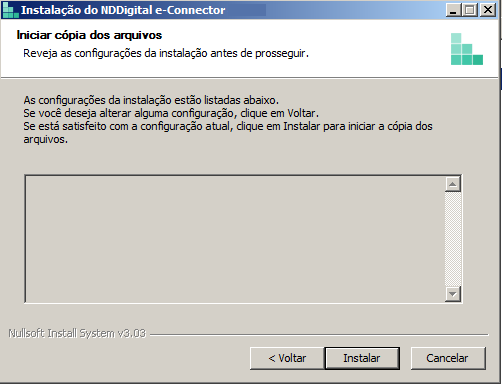 Passo 10: As configurações realizadas são listadas antes de iniciar a instalação. Reveja as configurações, caso deseje alterar alguma delas, clique em voltar. Se todos os parâmetros configurados estiverem de acordo com o desejado, clique no botão Instalar para iniciar a instalação do produto.