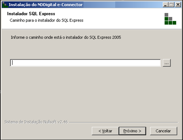 Caso seja selecionada a opção SQL Express 2005, deve-se informar o caminho onde se encontra o instalador do Microsoft SQL Express 2005. A tela abaixo será exibida. Clique em Próximo para prosseguir: |