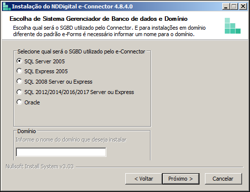 Passo 2: Selecione o Sistema Gerenciador de Banco de dados a ser utilizado pelo Connector. Os SGBD’s compatíveis com o módulo e-Connector são:
