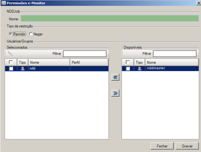 e.Através desta tela é possível permitir ou negar acesso aos usuários ou grupos, basta selecioná-los na guia Disponíveis e clicar em