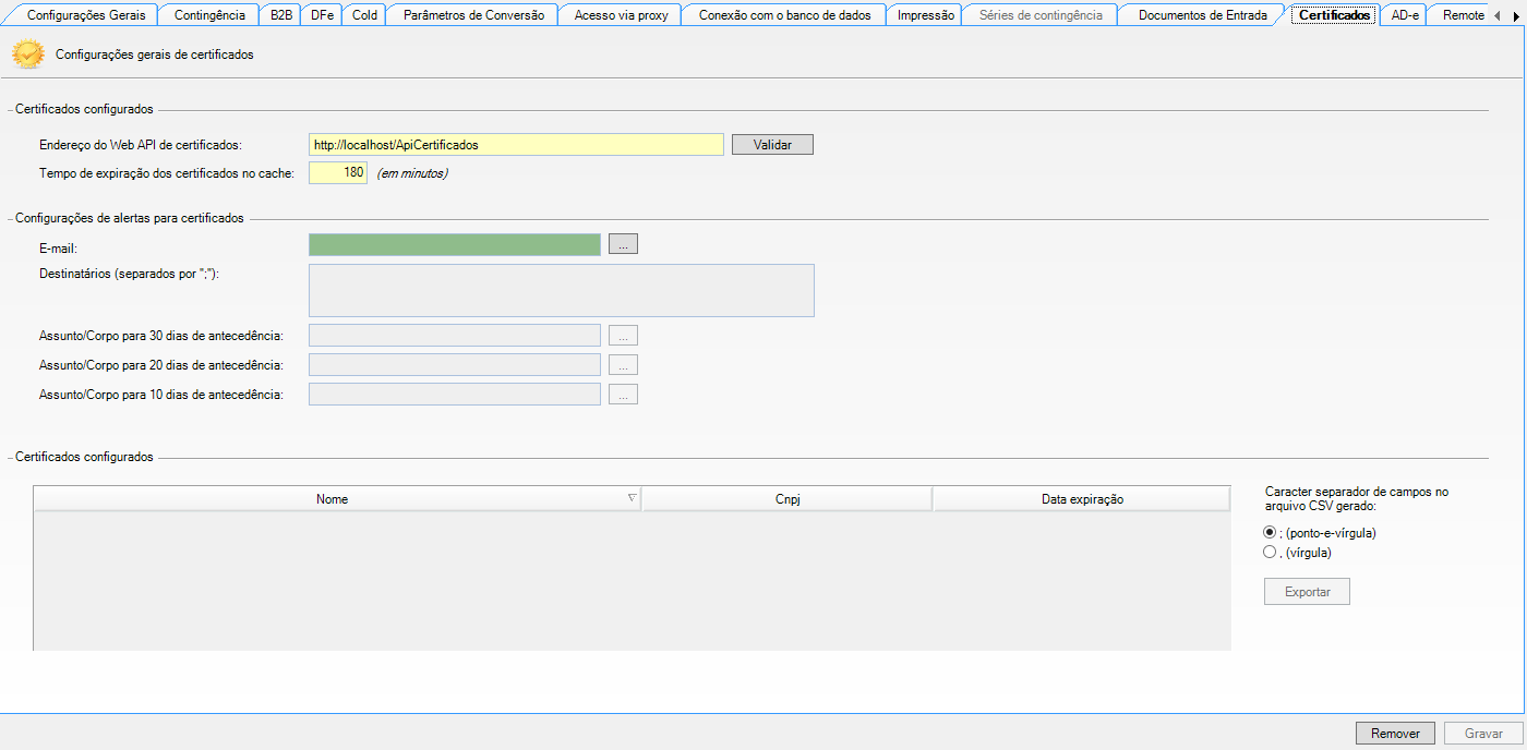 e.No campo E-mail, selecione a conta de e-mail a ser utilizada para enviar alertas, caso haja algum certificado prestes a expirar.
