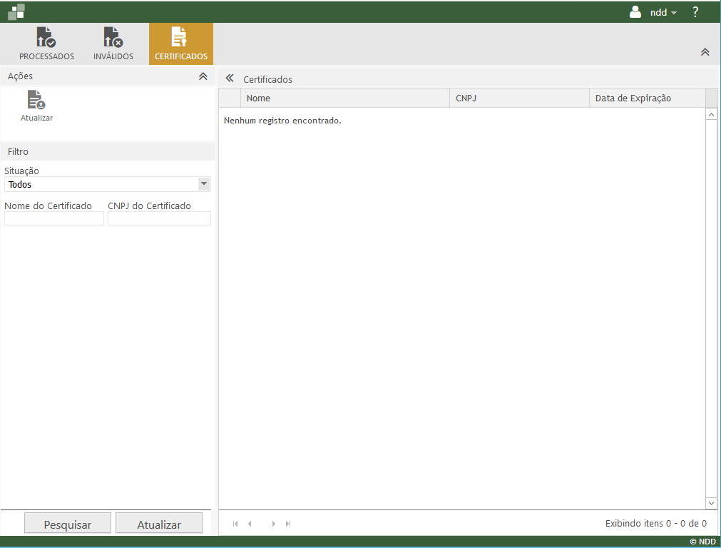 Nesta aba estará disponível os certificados que foram vinculados à algum job.