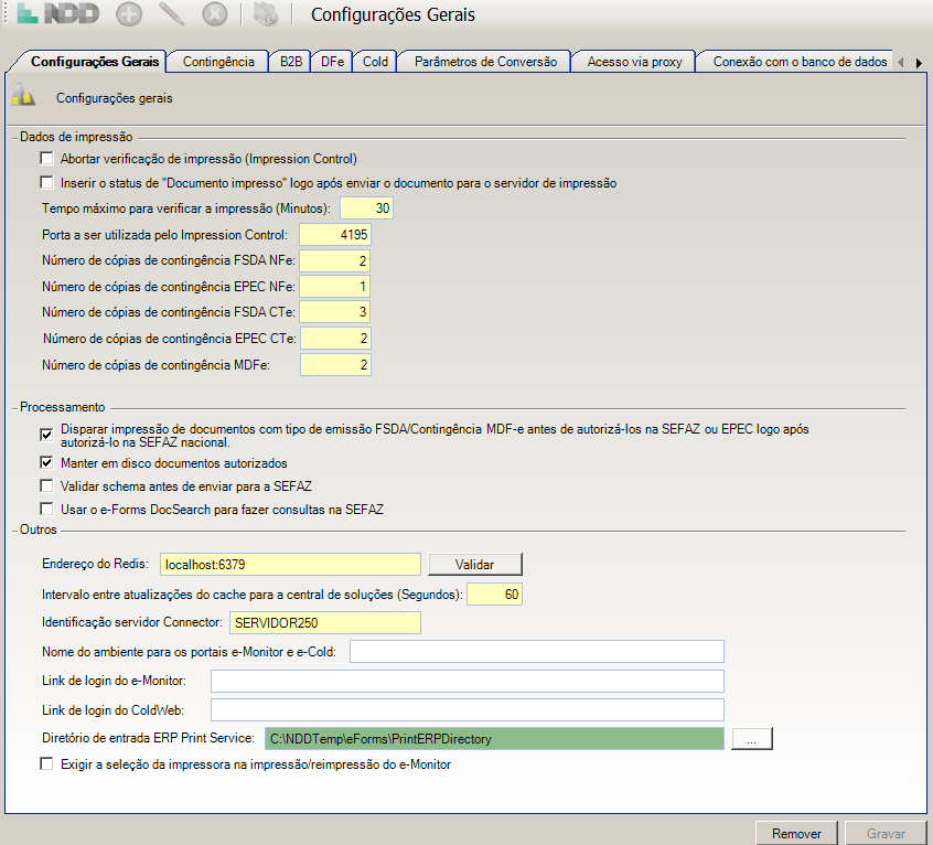 Abortar verificação de impressão (Impression Control): esta opção desabilita a comunicação com o Impression Control, serviço que é instalado com o módulo e-Print e é responsável por confirmar a impressão dos documentos.