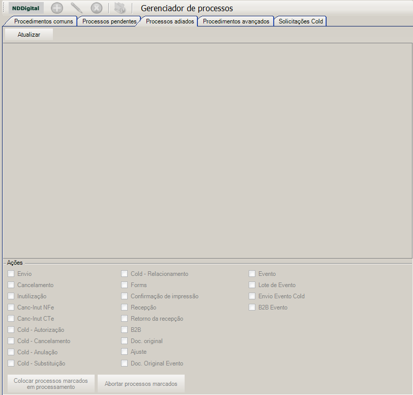 Esta guia funciona de forma parecida com a anterior, porém traz os processos adiados. Pode-se abortar ou recolocar para processamento qualquer um dos processos adiados, isso significa trocar o seu status de adiado para não processado.