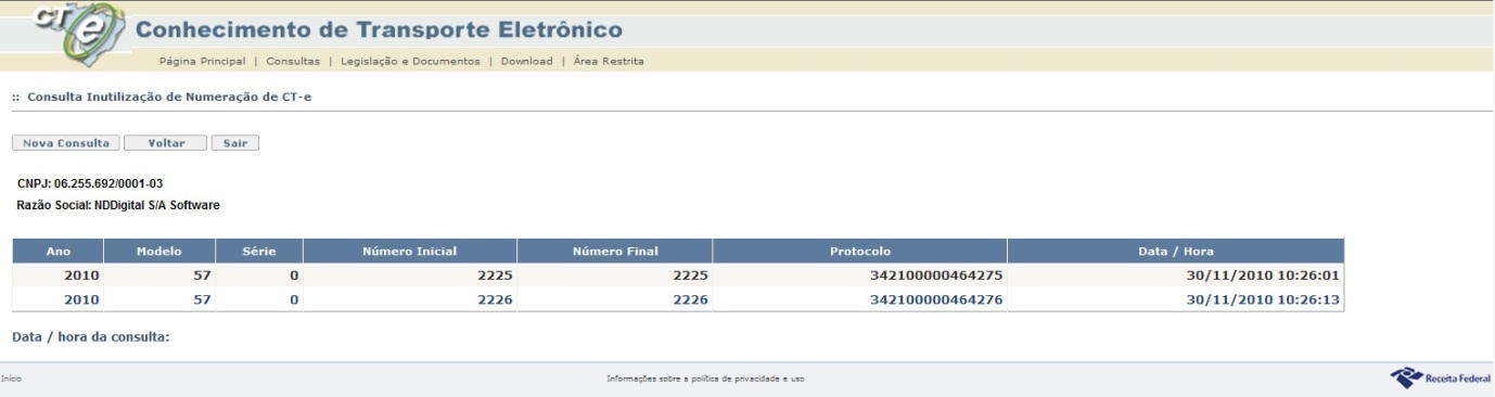 b.Clique no link Consulta de Inutilização de Numeração de CT-e