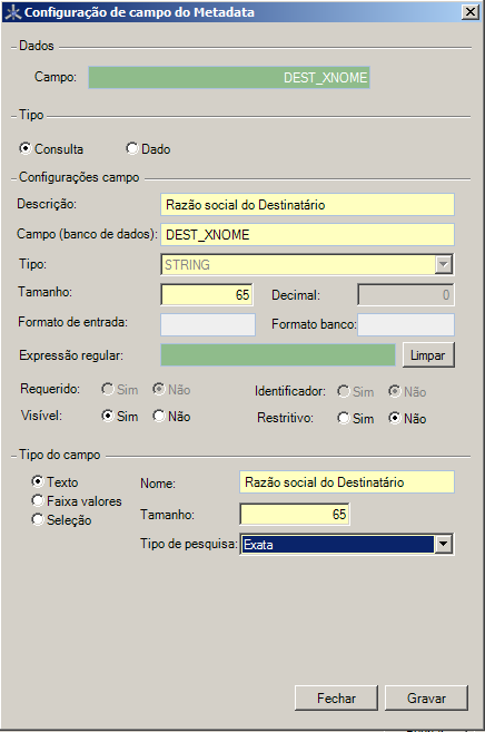 •Clique em Gerenciar para configurar as informações com as definições de campos de consulta e campos de dados, que serão gravadas em um arquivo no banco de dados de configuração, chamado METADATA. A tela abaixo será exibida: