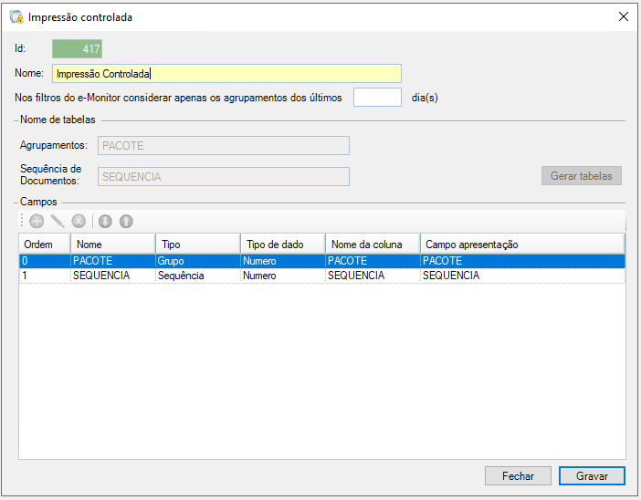 Os campos Grupo e Sequência são obrigatórios, porém os campos Contador e Filtro são opcionais, entretanto, quando configurados os respectivos campos em Impressão Controlada deve conter no campo Nome e na massa de dados a mesma informação, respeitando as letras maiúsculas e minúsculas, ou seja, o nome configurado deve ser igual ao que consta na linha 10300. |