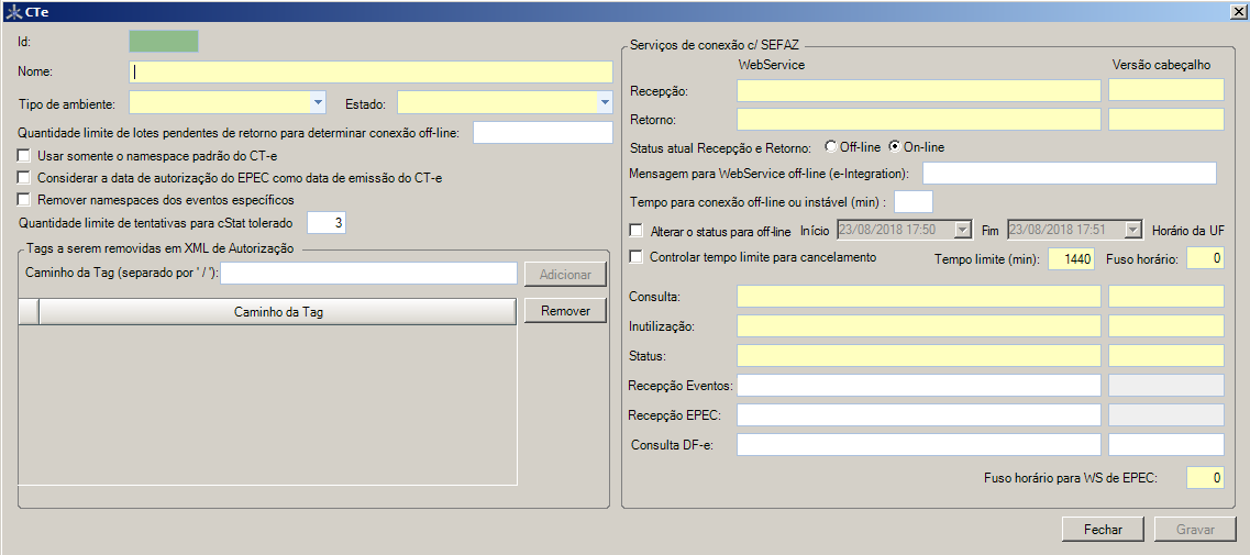 t.Fuso horário: Caso seja necessário informar a diferença de fuso horário da SEFAZ em relação ao horário do servidor, podendo ser configurado valores entre -120 a 120 minutos.