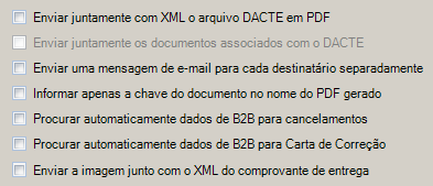 É possível também optar por enviar o DACTE em PDF, juntamente com o XML, bem como enviar os documentos associados juntamente com o DACTE. E se desejar enviar mensagens de e-mail para cada destinatário separadamente, ou seja, enviar e-mail individual para cada destinatário.