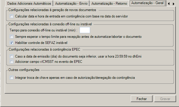 •Automatizar a geração de contingência para documentos pendentes de envio abortados: Quando marcada irá criar um novo documento em substituição de um documento pendente de envio que tenha sido abortado.