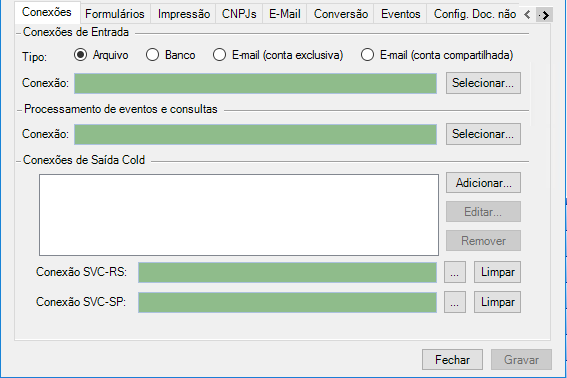 e adicione o local de captura dos documentos de entrada. Se marcada a opção Arquivo, serão exibidas as Conexões de Entrada Baseadas em Arquivo para a seleção. Se marcada a opção Banco, serão exibidas as Conexões de Entrada Baseadas em banco para a seleção. Se marcada a opção e-mail, serão exibidas as contas de e-mail previamente cadastradas, para a seleção. Esta conexão será responsável por capturar arquivos para o entry documents processar, podendo ser diretamente em xml "Proc" ou um arquivo compactado ".zip" contendo xmls.