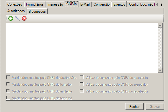 para inserir os CNPJs desejados, podendo ser informado apenas o CNPJ raiz e para ser permitidos apenas os documentos com o CNPJ previamente cadastrado deverá ser marcado uma das opções abaixo: