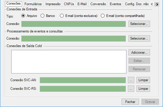 e adicione o local de captura dos documentos de entrada quando o processamento for para eventos ou consultas. A conexão de entrada para processamento de eventos e consultas está disponível somente para entrada baseada em arquivos ou baseado em banco de dados, e somente será permitido processar arquivos no formato TXT ou XML do eventos NF-e (manifestação do destinatário) ou com o prefixo ped-evt ou arquivos para consultas no formato ped-cons, ped-list e ped-down.