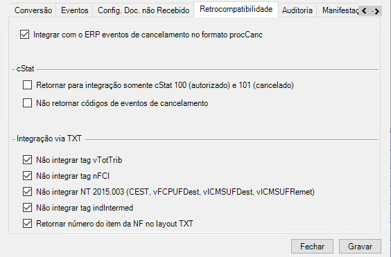 •Quando marcada a opção Não retornar códigos de eventos de cancelamento, fará com que os documentos cancelados por cStat 135 retorne na integração o cStat 101, e cancelados pelo cStat 155 integrar o cStat 151.