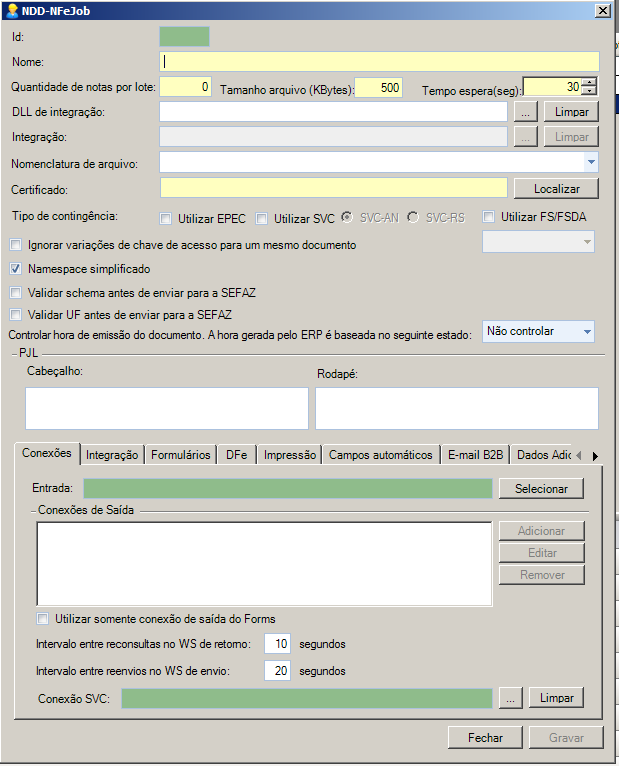 •Para a conexão SVC que foi selecionada no Job, serão utilizados somente os endereços dos WebServices e as versões de cabeçalho configuradas, outros dados como o tipo de ambiente ou estado serão utilizados na conexão do Job.