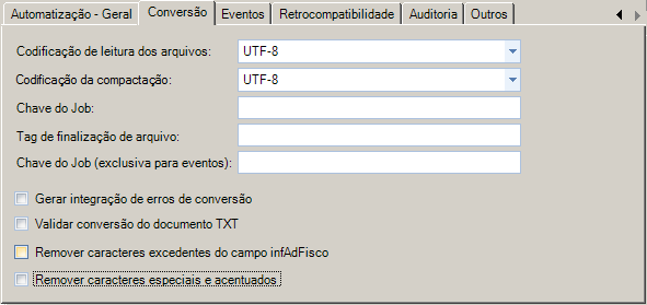 •Remover caracteres especiais e acentuados: deverá ser utilizada quando for necessário remover do arquivo TXT em formato UTF-8 e XML, caracteres acentuados, sendo substituídos por seu correspondente sem acento.