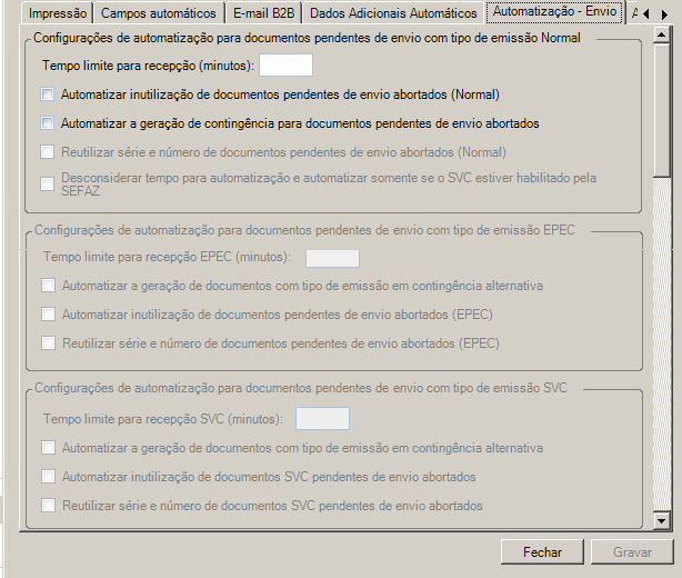 Configurações de automatização para documentos pendentes de envio com tipo de emissão SVC: