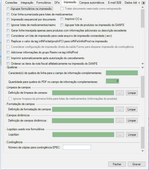 Remover espaços em branco: quando marcada, são retirados os espaços em branco à esquerda de cada campo do DANFE, para enviá-los a impressão facilitando a formatação dos mesmos.