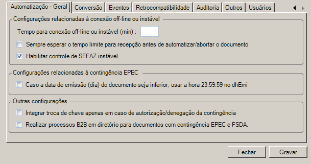 •Automatizar a geração de contingência para documentos pendentes de envio abortados: Quando marcada irá criar um novo documento em substituição de um documento pendente de envio que tenha sido abortado.