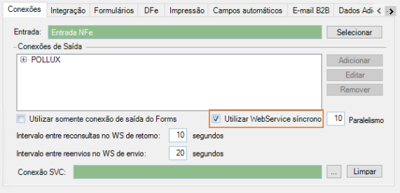 72. Ao utilizar a comunicação síncrona para NF-e, é necessário assinalar o checkbox de "Utilizar WebService síncrono".
