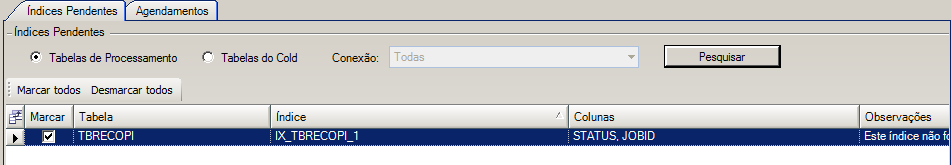 •Índices Pendentes: Selecione qual tabela deseja executar a varredura (processamento ou Cold) e clique em pesquisar;