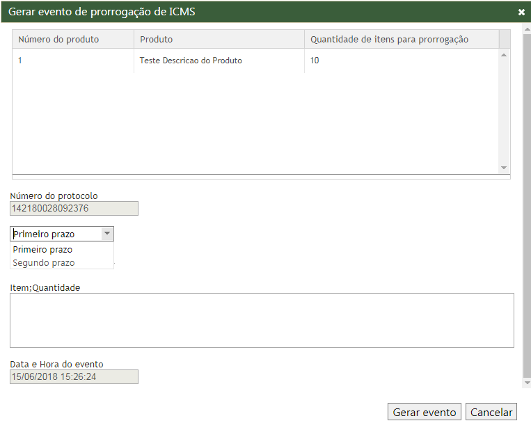 A ação "Criar Prorrogação" tem a finalidade de gerar eventos de prorrogação de ICMS através do portal web e-Monitor.