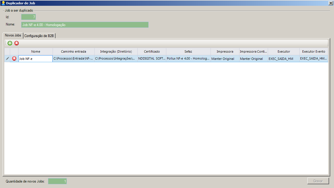 Nessa aba existirá apenas uma linha com as configurações de B2B, sendo assim, essas configurações serão aplicadas em todos os Jobs duplicados. Não sendo possível adicionar outras linhas. |