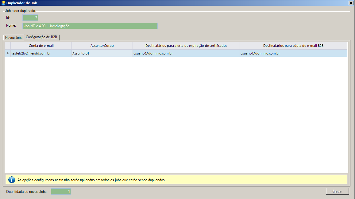 Através dessa aba será possível alterar as informações de “Conta de e-mail”, “Assunto/Corpo” , “Alerta de expiração de certificados” e “Cópia do e-mail de B2B” no momento da duplicação, sendo que será possível apenas uma configuração de B2B no momento da duplicação do Job, portanto, todos os Jobs duplicados irão receber as mesmas configurações definidas nessa aba.
