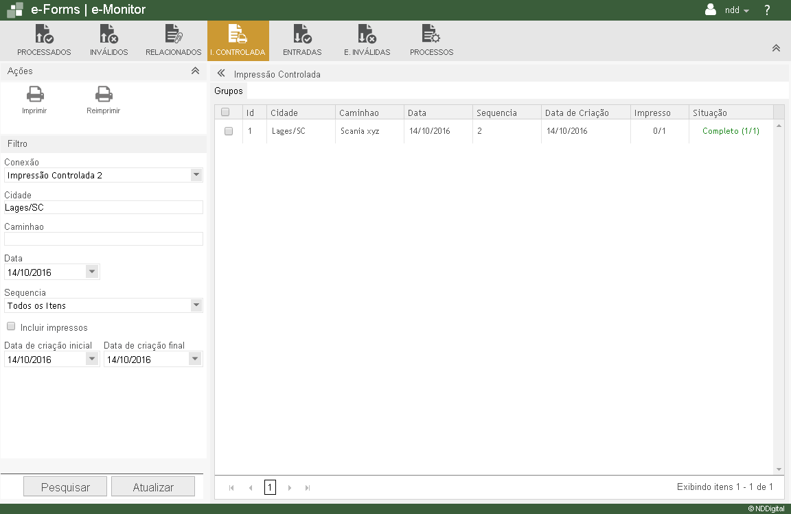 Os Filtros são exibidos conforme configurado em Impressão Controlada, basta criar os campos de acordo com as informações que deseja realizar a consulta. A aba Documentos apresenta todos os documentos processados no agrupamento, sendo que na aba Grupos somente é exibido o grupo a qual o documento pertence.