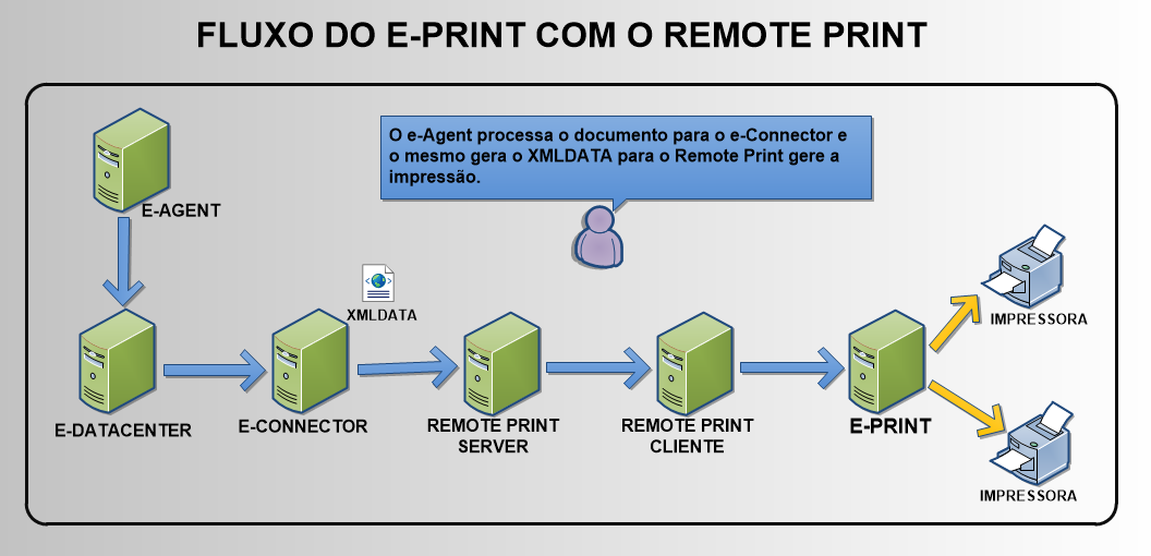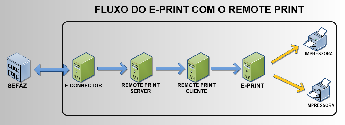 •Os Remote Print Client fazem checagens continuas em busca de pacotes de impressão. Quando encontra um pacote, é realizado o download dos dados compactados para as filas internas do módulo e-Print: a partir daqui realiza os mesmos procedimentos da impressão direta, menos a confirmação de impressão que não é disponibilizada.