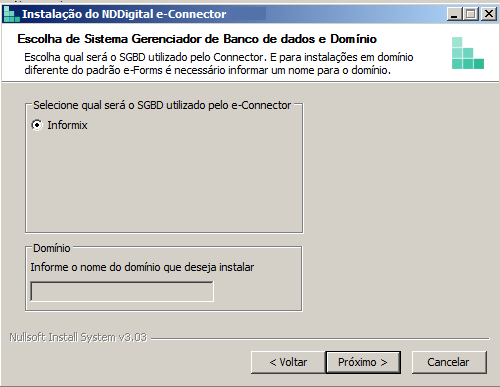 Para a instalação do e-Connector utilizando o Informix é necessário solicitar ao Suporte da NDD os scripts de criação de banco, antes de aplicar a instalação do módulo e-Connector, pois os instaladores da solução e-Forms não levam os scripts para criação da base de dados. Também será necessário criar uma base para exportação dos documentos do Cold, conforme passos abaixo, desta forma serão utilizadas duas bases de dados: base de processamento e base de exportação Cold. O módulo e-Connector possui um instalador diferente para o SGBD Informix e é homologado. |
