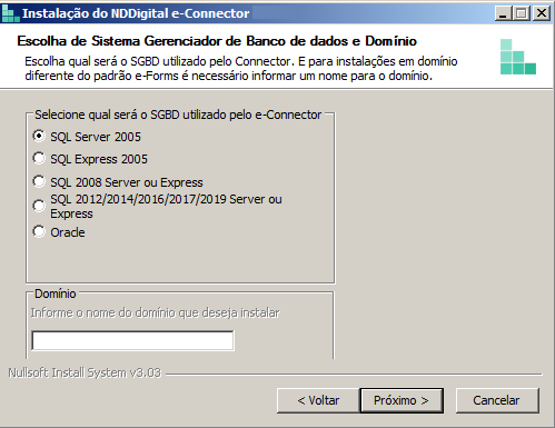 Passo 2: Selecione o Sistema Gerenciador de Banco de dados a ser utilizado pelo Connector. Os SGBD’s compatíveis com o módulo e-Connector são: