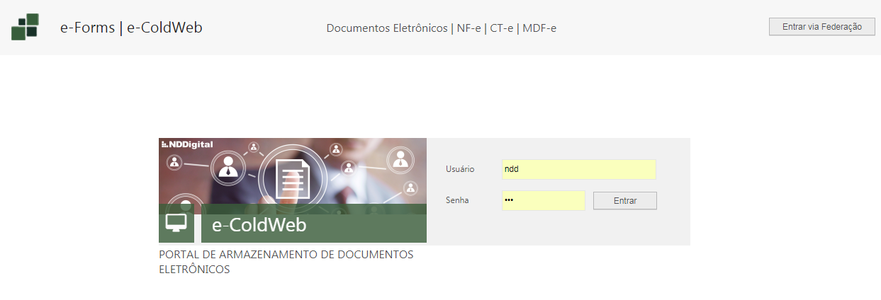 Ao abrir o e-Forms e-ColdWeb será exibido a tela abaixo, digite o Usuário e a Senha e clique em Entrar.