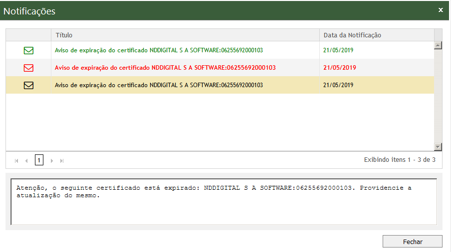 Efetue um clique na mensagem desejada e leia o conteúdo da notificação no campo logo abaixo. As cores têm a seguinte representação: