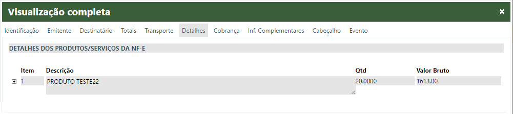 Para documentos NF-e os detalhes dos produtos serão exibidos na aba "Detalhes" e este apresentará Item, Descrição e QTD e Valor Bruto de cada produto.