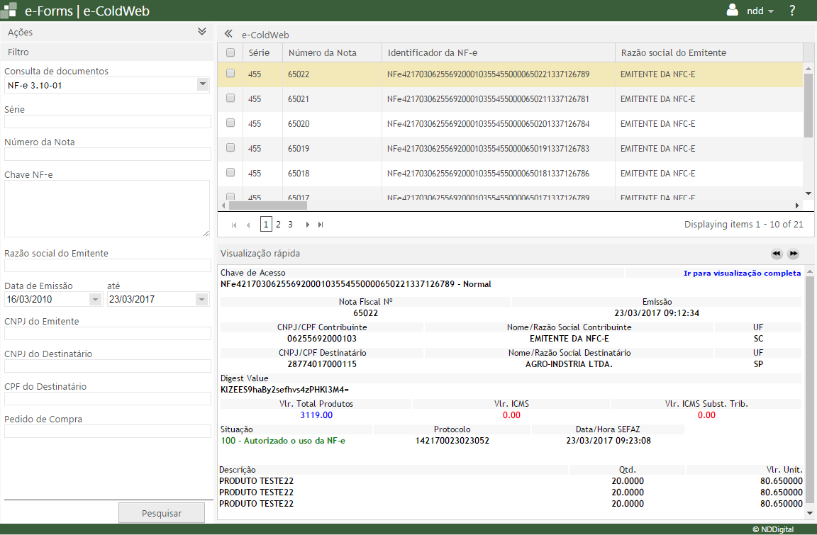 Para visualizar todos os dados contidos na Nota Fiscal Eletrônica (NF-e), Conhecimento de Transporte Eletrônico (CT-e) ou Manifesto Eletrônico de Documentos Fiscais (MDF-e), basta selecionar um documento no Grid, logo abaixo na área destinada à visualização rápida. Será criado um link para a visualização completa, como mostra a figura abaixo: