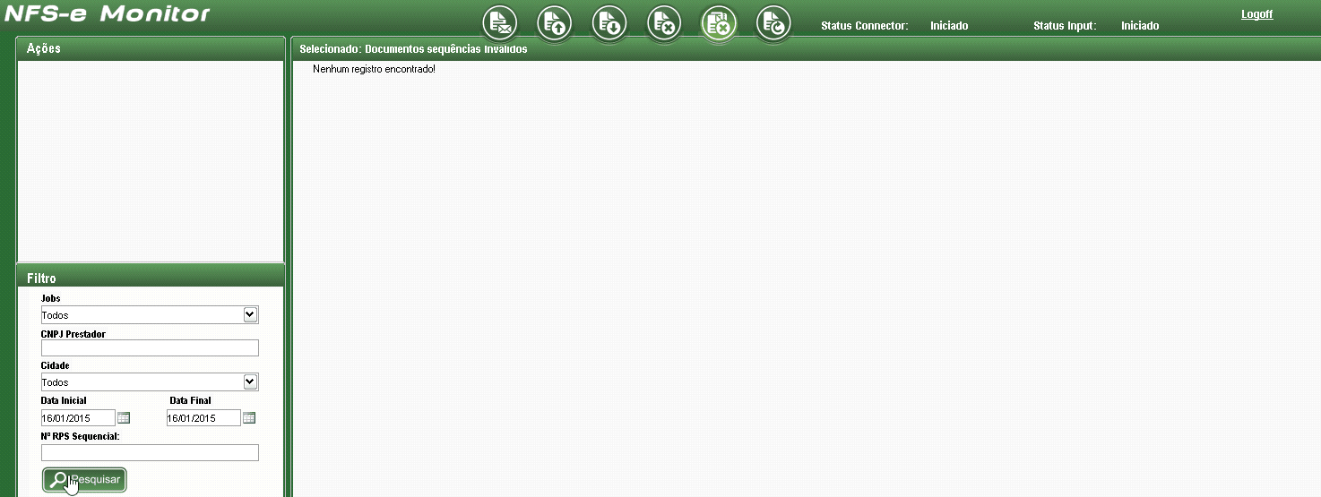 Nesta aba estão localizados os documentos que o serviço NDDigital NFS-e Input detectou a falta de alguma informação no arquivo que estava sendo enviado para a prefeitura. Para esta aba serão apresentados apenas os documentos enviados pelo Job que está com a configuração de sequencial Habilitada. Tela de Documentos Inválidos