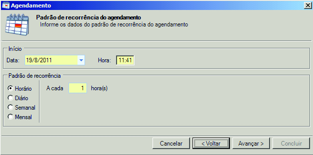 Passo 3: No campo Início, informe a Data e a Hora que o agendamento deverá iniciar o processo de solicitação de NFS-e de entrada ao Web Service da prefeitura.