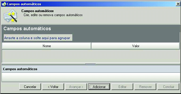 Passo 3: Na tela Campos automáticos, exibida abaixo, clique no botão Adicionar. Nesta tela também é possível editar ou remover campos automáticos já cadastrados.