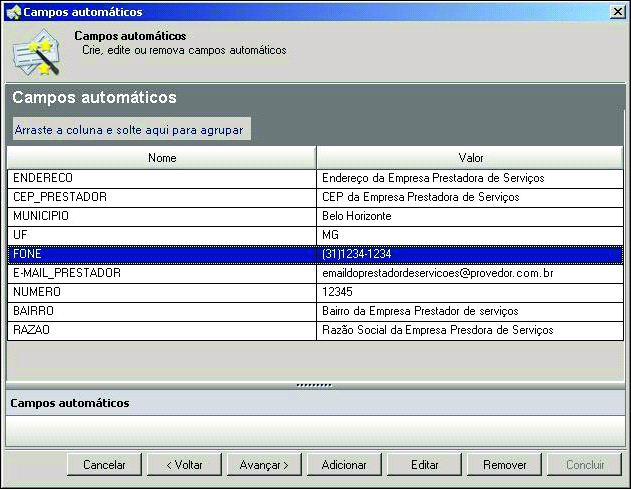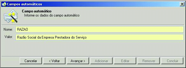 Passo 5: Após ter cadastrado todos os campos automáticos, como mostra a tela abaixo, clique no botão Avançar para prosseguir com o cadastro. Nesta tela também é possível editar ou remover um campo automático já cadastrado.