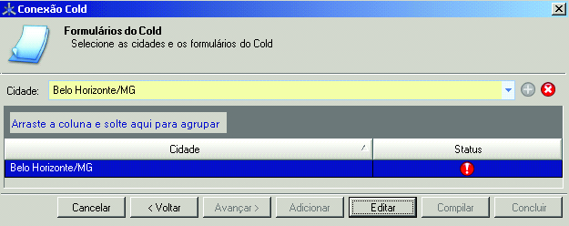 Passo 4: A tela Base de dados Cold exibe as configurações do SGBD configurado e as credenciais de acesso já configuradas anteriormente na aba Configurações Cold, confira os dados informados e clique no botão Tela Base de dados Cold. Passo 5: Na tela de seleção de cidades e formulários Cold, no campo Cidade, selecione a cidade que será configurada e clique no botão Localizado do lado direito do campo Cidade. Note que ao incluir a cidade é exibida uma bolinha vermelha com um ponto de exclamação dentro, isso indica que ainda não foram selecionados os formulários Cold pertinentes a esta cidade.