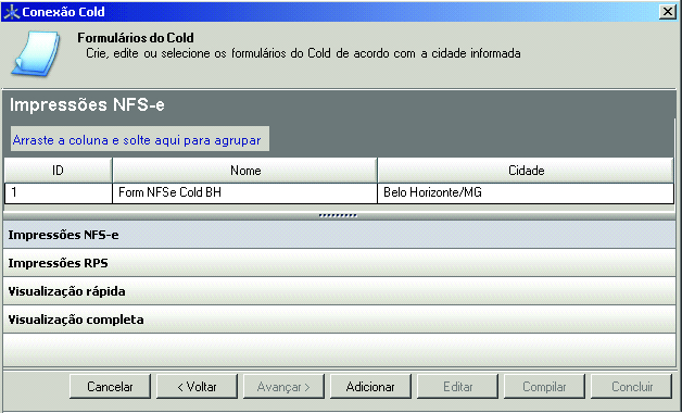 Passo 7: Na tela de seleção de formulários Cold é necessário selecionar um formulário para cada tipo de visualização ou impressão, sendo quatro formulários Cold a serem selecionados. Após selecionar todos os formulários o botão Tela de seleção dos formulários Cold