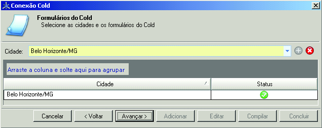 Passo 8: Note que agora na tela de seleção de cidades do Cold, a bolinha que estava com uma exclamação agora está verde e com um sinal de correto dentro, isso indica que todos os formulários Cold foram selecionados. Selecione a cidade desejada e clique no botão