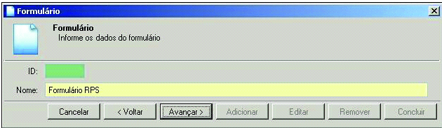 Passo 8: Na tela Formulário que é exibida, informe o nome do formulário no campo Nome. Após informar o nome, clique no botão Avançar que logo será habilitado Adicionando um Formulário de Impressão RPS