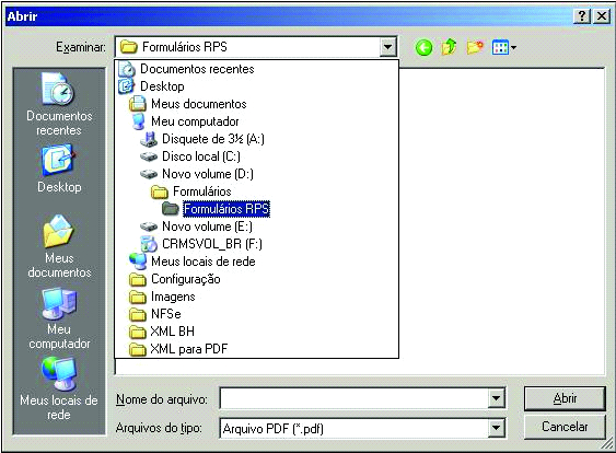 Seleção do arquivo PDF do Documento Formulário filho da Impressão RPS