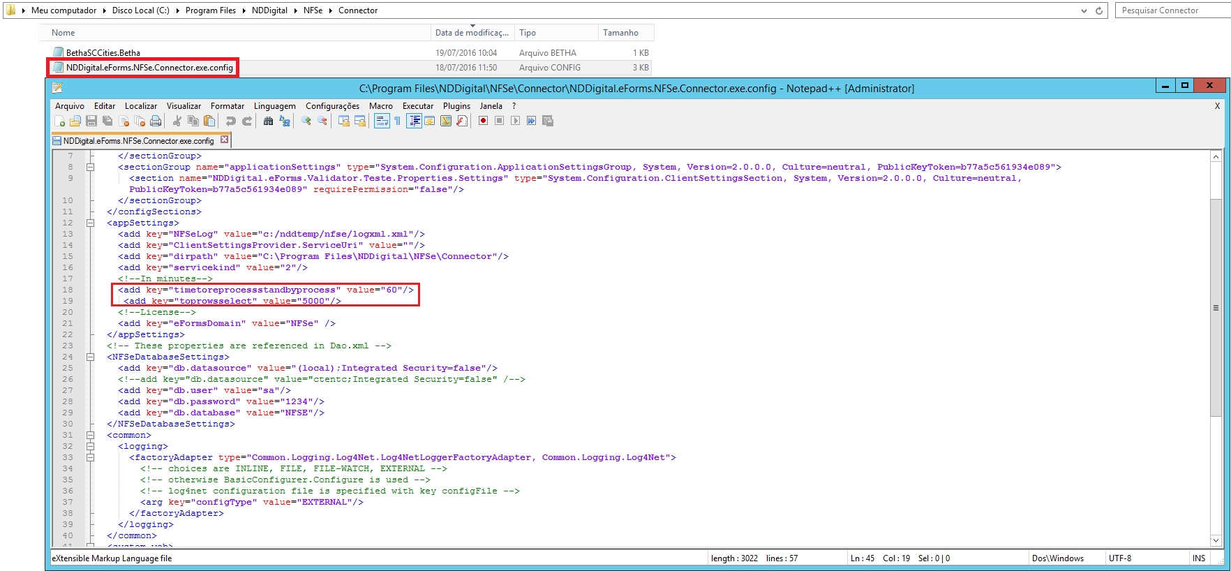 Passo 2: Edite o arquivo "NDDigital.eForms.NFSe.Connector.exe.config" e localize a tag "timetoreprocessstandbyprocess" e no atributo da tag "value" preenche o campo com o valor desejado em minutos. Por default o valor do campo é preenchido com "60", sendo assim, a Thread do NFS-e Connector será reiniciada a cada 60 minutos reprocessando os documentos que estão em espera.