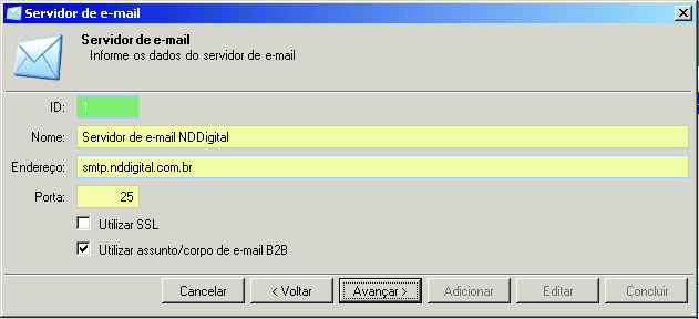 Passo 8: Será exibida a tela Servidor de e-mail onde é possível criar, editar ou selecionar um servidor de e-mail. Para adicionar um servidor de e-mail clique em Adicionar, a tela do Assistente de Servidor de E-mail será exibida, clique em Avançar.