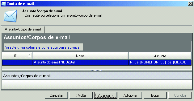 Passo 19: Será exibida a tela de seleção de Assuntos/Corpos de e-mail, selecione um assunto/corpo de e-mail cadastrado e clique em Avançar.