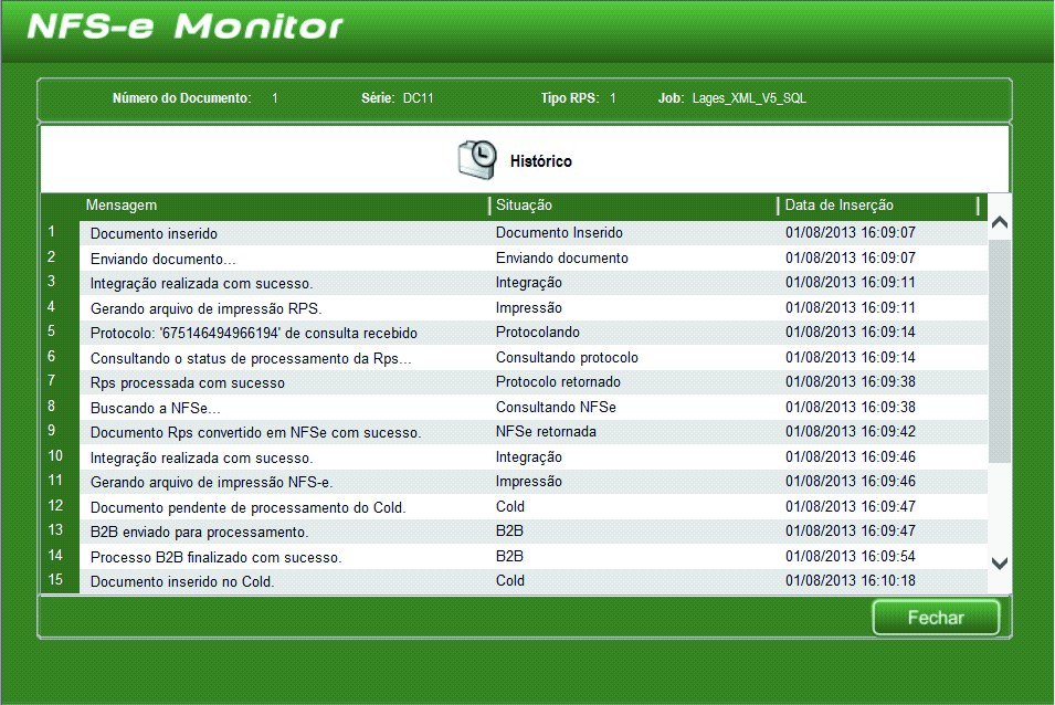 A opção Detalhes é utilizada para verificar as informações de envio do documento. Para visualizar as informações do documento, clique uma vez em cima do documento desejado e em seguida clique no botão Detalhes. As informações do documento também podem ser visualizadas clicando duas vezes em cima do documento desejado. Tela de visualização das informações dos documentos |