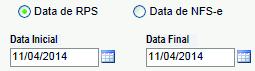 Os filtros, Data inicial e Data final são utilizados para filtrar os documentos por um período de tempo específico. O intervalo de tempo máximo e mínimo que será realizado a pesquisa é determinado pelo usuário. Quando logado no portal do Cold Web a data inicial e data final é apresentada com a data do dia atual. Existem duas formas de realizar a pesquisa por Data de RPS e NFS-e, onde: Data de RPS: Realiza a pesquisa pela Data de emissão da RPS que é armazenado na tabela do Cold Web do município. Data de NFS-e: Realiza a pesquisa pela Data de emissão da NFS-e que é armazenado na tabela do Cold Web do município. Filtro por Data |